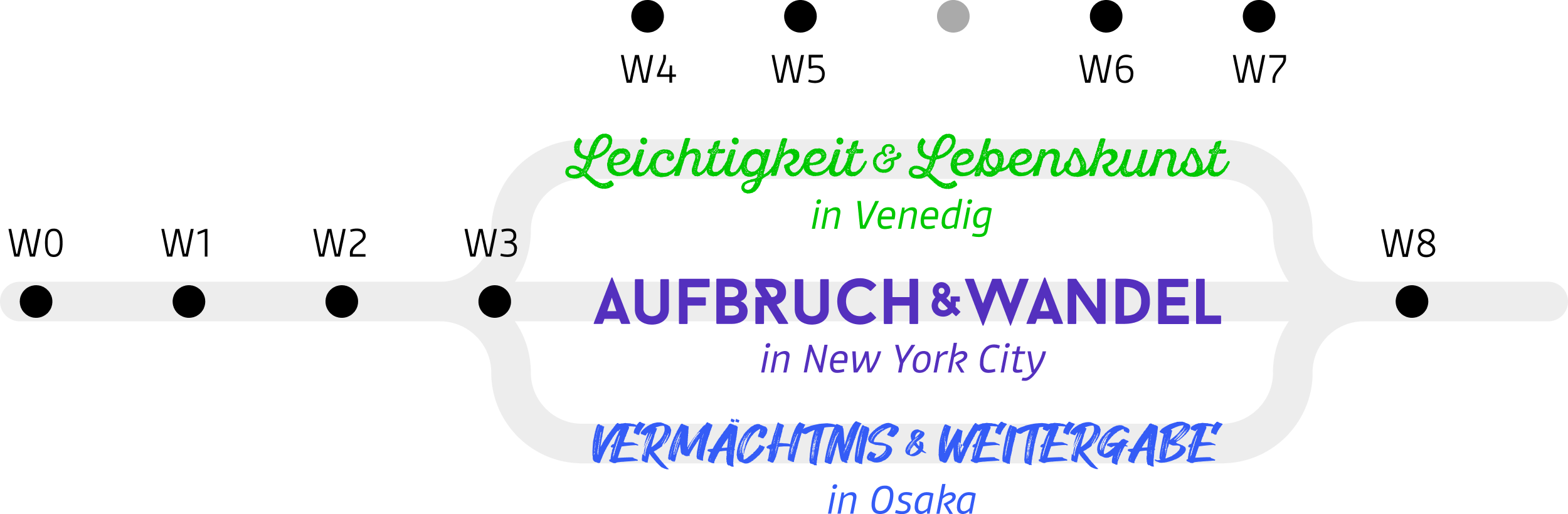 Ganz gleich, welche Option du wählst – Venedig, New York oder Osaka – jeder Pfad führt dich zu neuen Erfahrungen, wertvollen Erkenntnissen und echten Verbindungen. Du bekommst Impulse, Aufgaben und Begleitung, die dich stärken und inspirieren. Die Wahl liegt bei dir: Welcher Pfad passt zu deinem nächsten Lebenskapitel? Lass dich auf dein Bonusjahrzehnt ein und entdecke, wie vielfältig dein eigener Weg sein kann.